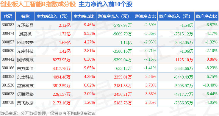 资金流向方面,创业板人工智能R(470070)指数成份股当日主力资金净流出合计32.2亿元,游资资金净流入合计4.97亿元,散户资金净流入合计27.23亿元。成份股资金流向详情见下表: