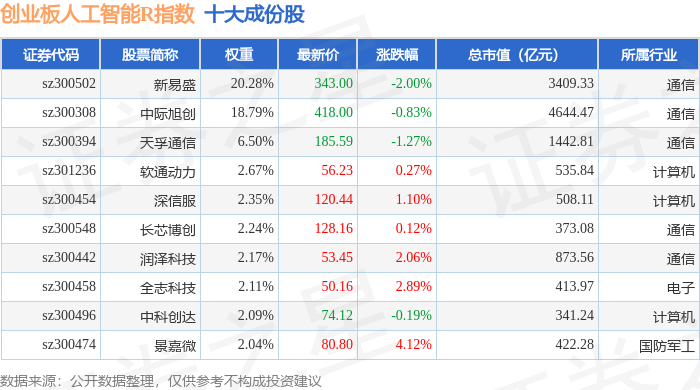 创业板人工智能R(470070)指数十大成份股详情如下: