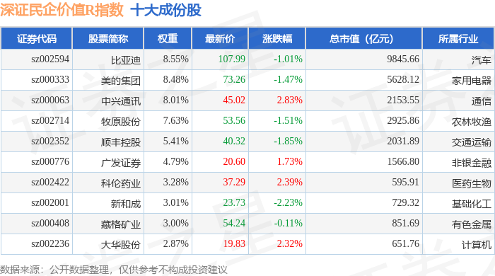 深证民企价值R(470072)指数十大成份股详情如下: