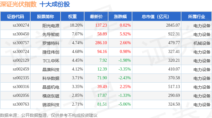 证券之星消息,9月22日,深证光伏(970035)指数报收于3454.21点,涨0.35%,成交469.63亿元,换手率2.82%。当日该指数成份股中,上涨的有20家,精工科技以10.01%的涨幅领涨,下跌的有30家,锦浪科技以5.06%的跌幅领跌。