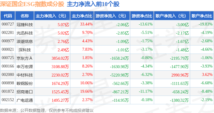 资金流向方面,深证国企ESG(970055)指数成份股当日主力资金净流入合计1.03亿元,游资资金净流出合计7.21亿元,散户资金净流入合计6.18亿元。成份股资金流向详情见下表: