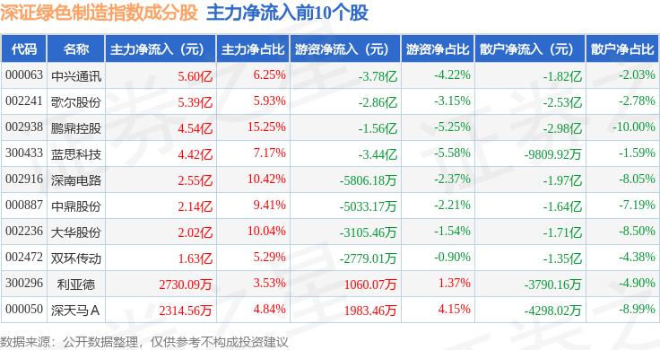 资金流向方面,深证绿色制造(970069)指数成份股当日主力资金净流出合计30.59亿元,游资资金净流入合计5.47亿元,散户资金净流入合计25.13亿元。成份股资金流向详情见下表: