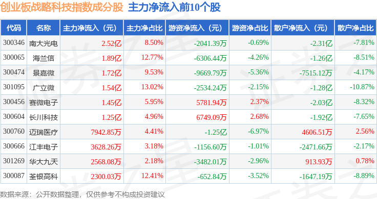 资金流向方面,创业板战略科技(971004)指数成份股当日主力资金净流出合计3988.84万元,游资资金净流出合计2.95亿元,散户资金净流入合计3.35亿元。成份股资金流向详情见下表: