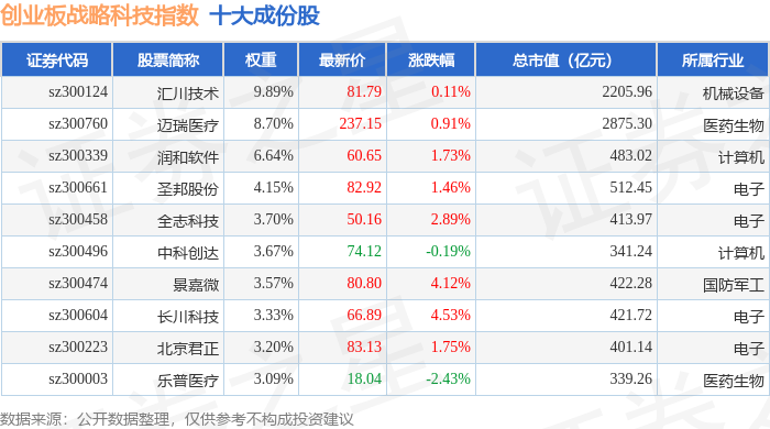 证券之星消息,9月22日,创业板战略科技(971004)指数报收于6546.63点,涨1.27%,成交403.28亿元,换手率3.55%。当日该指数成份股中,上涨的有33家,广立微以11.68%的涨幅领涨,下跌的有17家,乐普医疗以2.43%的跌幅领跌。