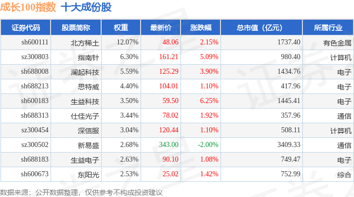 证券之星消息,9月22日,成长100(980080)指数报收于9782.28点,涨1.83%,成交1068.78亿元,换手率3.43%。当日该指数成份股中,上涨的有62家,盈趣科技以10.01%的涨幅领涨,下跌的有37家,新相微以8.85%的跌幅领跌。