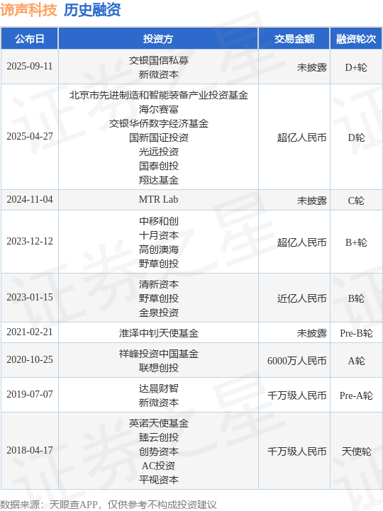 证券之星消息,根据天眼查APP于9月11日公布的信息整理,北京谛声科技有限责任公司D+轮融资,融资额未披露,参与投资的机构包括交银国信私募,新微资本。