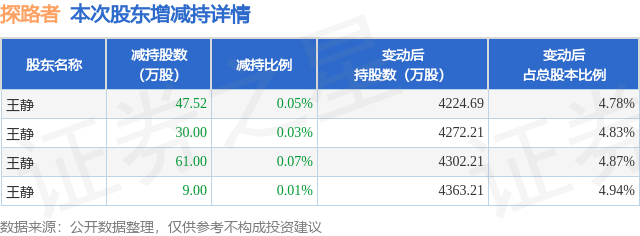 证券之星消息,9月22日探路者发布公告《探路者:简式权益变动报告书》,其股东王静于2025年9月15日至2025年9月22日间合计减持147.52万股,占公司目前总股本的0.1669%,变动期间该股股价上涨3.58%,截止9月22日收盘报9.55元。