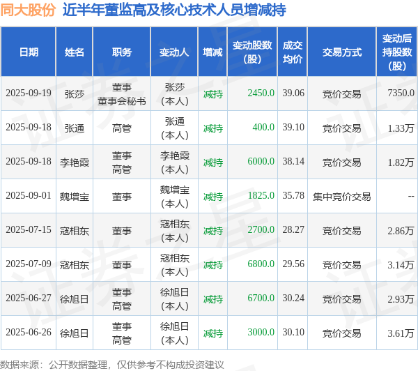 同大股份近半年内的董监高及核心技术人员增减持详情如下: