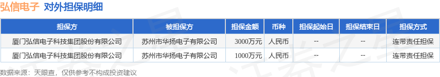 弘信电子9月22日披露2笔对外担保,被担保方为苏州市华扬电子有限公司。对外担保明细如下表: