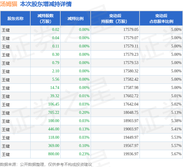 证券之星消息,9月22日汤姆猫发布公告《汤姆猫:关于股东部分股份减持、解除质押、解除司法冻结暨权益变动的提示性公告》,其股东王健于2025年5月26日至2025年9月19日间合计减持2707.65万股,占公司目前总股本的0.7702%,变动期间该股股价下跌1.88%,截止9月19日收盘报5.22元。