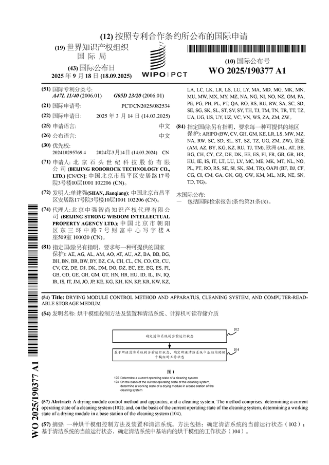 证券之星消息,根据企查查数据显示石头科技(688169)公布了一项国际专利申请,专利名为“烘干模组控制方法及装置和清洁系统、计算机可读存储介质”,专利申请号为PCT/CN2025/082534,国际公布日为2025年9月18日。