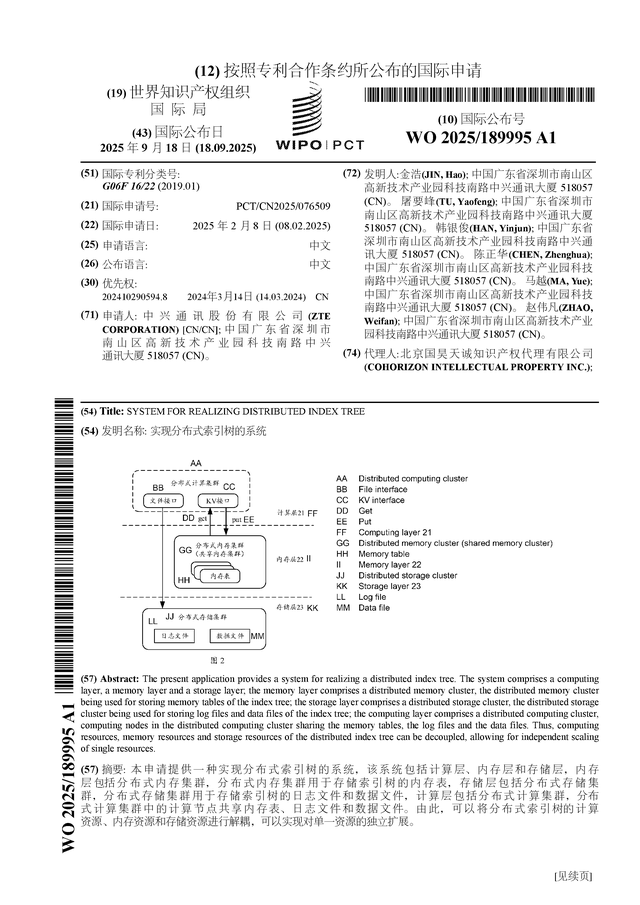 证券之星消息,根据企查查数据显示中兴通讯(000063)公布了一项国际专利申请,专利名为“实现分布式索引树的系统”,专利申请号为PCT/CN2025/076509,国际公布日为2025年9月18日。