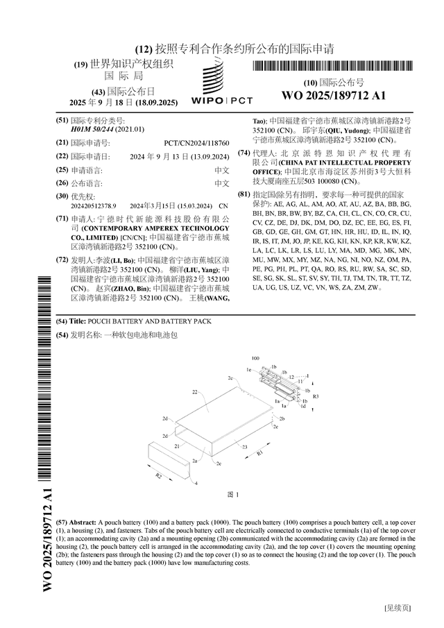 证券之星消息,根据企查查数据显示宁德时代(300750)公布了一项国际专利申请,专利名为“一种软包电池和电池包”,专利申请号为PCT/CN2024/118760,国际公布日为2025年9月18日。