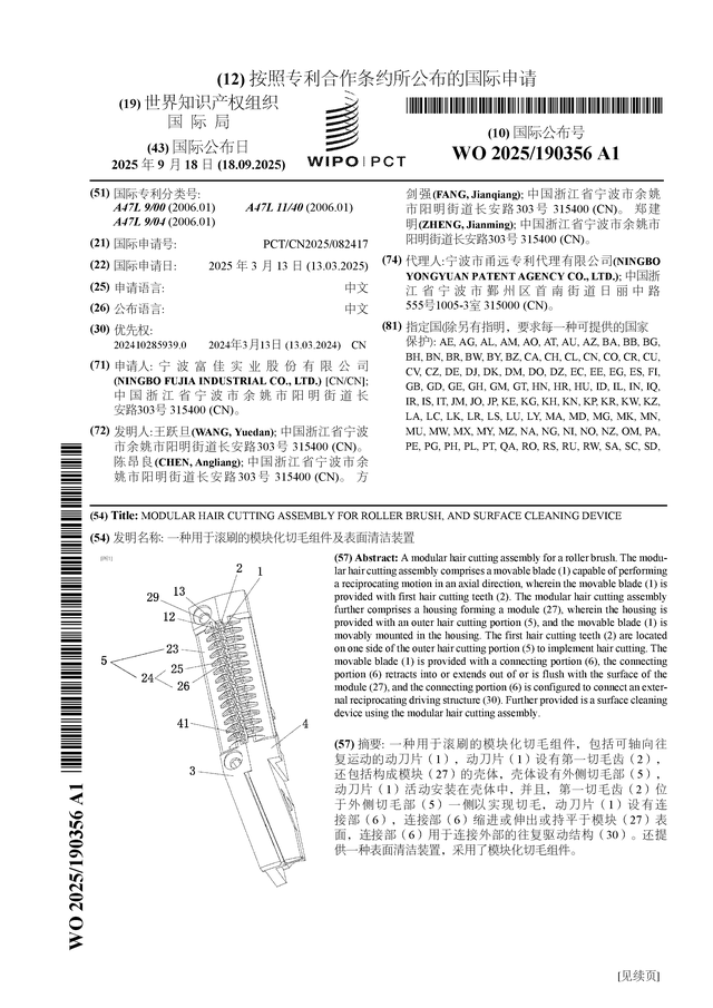 证券之星消息,根据企查查数据显示富佳股份(603219)公布了一项国际专利申请,专利名为“一种用于滚刷的模块化切毛组件及表面清洁装置”,专利申请号为PCT/CN2025/082417,国际公布日为2025年9月18日。