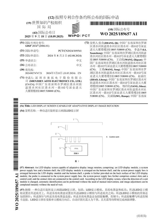 证券之星消息,根据企查查数据显示奥拓电子(002587)公布了一项国际专利申请,专利名为“一种自适应旋转显示画面LED显示屏”,专利申请号为PCT/CN2024/109541,国际公布日为2025年9月18日。