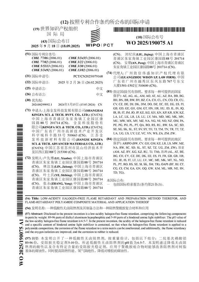 证券之星消息,根据企查查数据显示金发科技(600143)公布了一项国际专利申请,专利名为“一种低酸性无卤阻燃剂及其制备方法和一种阻燃聚酰胺复合材料和应用”,专利申请号为PCT/CN2025/079168,国际公布日为2025年9月18日。