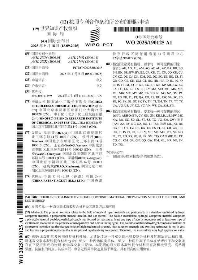 证券之星消息,根据企查查数据显示中国石化(600028)公布了一项国际专利申请,专利名为“一种双交联水凝胶复合材料及其制备方法和应用”,专利申请号为PCT/CN2025/080648,国际公布日为2025年9月18日。