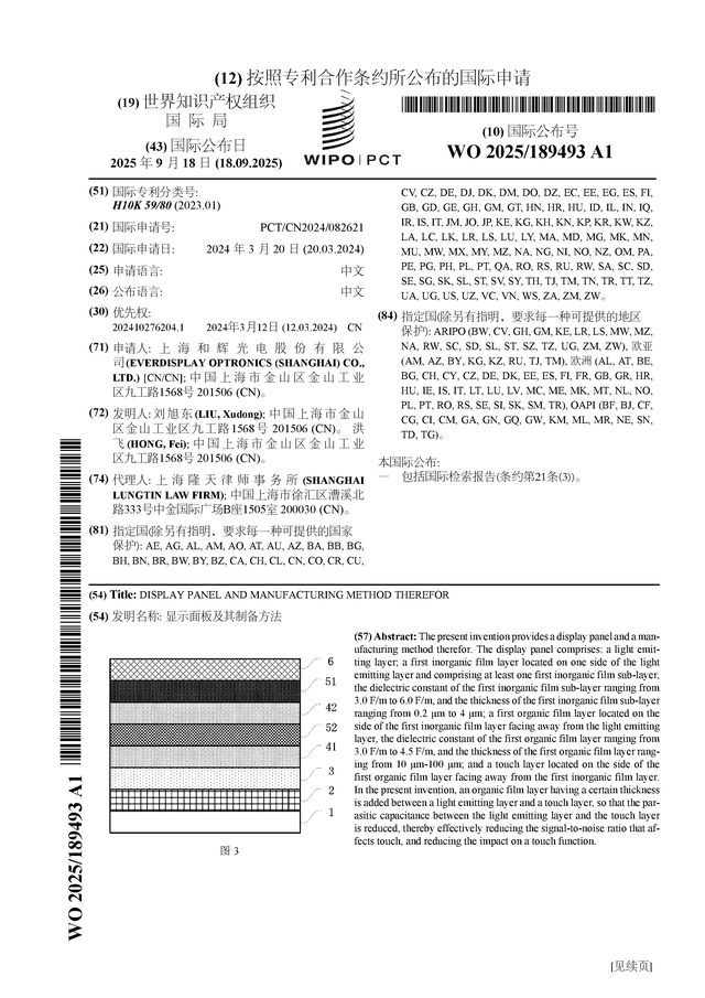证券之星消息,根据企查查数据显示和辉光电(688538)公布了一项国际专利申请,专利名为“显示面板及其制备方法”,专利申请号为PCT/CN2024/082621,国际公布日为2025年9月18日。