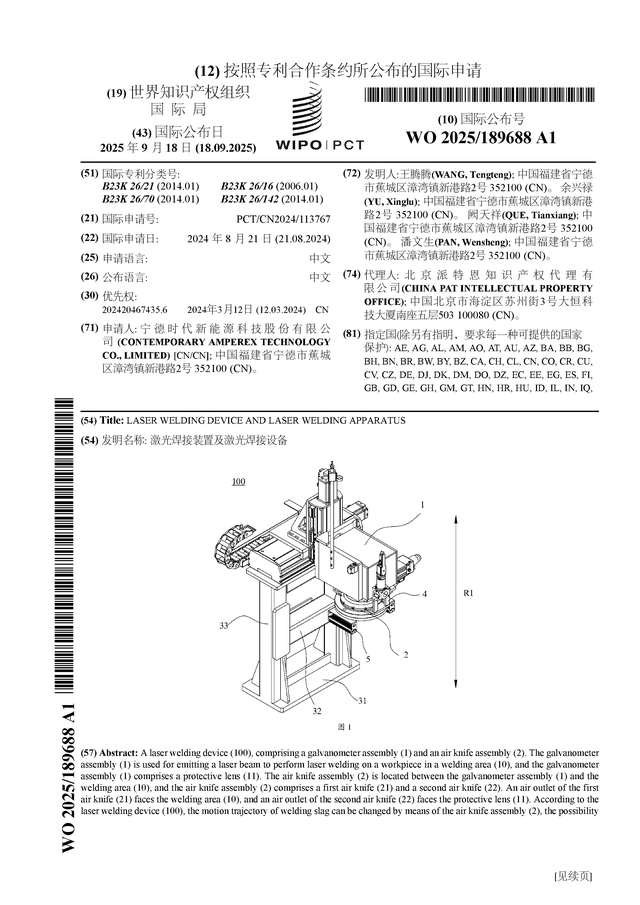 证券之星消息,根据企查查数据显示宁德时代(300750)公布了一项国际专利申请,专利名为“激光焊接装置及激光焊接设备”,专利申请号为PCT/CN2024/113767,国际公布日为2025年9月18日。