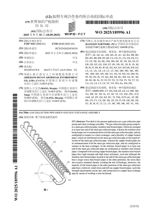 证券之星消息,根据企查查数据显示盾安环境(002011)公布了一项国际专利申请,专利名为“集气管组及换热组件”,专利申请号为PCT/CN2025/076539,国际公布日为2025年9月18日。