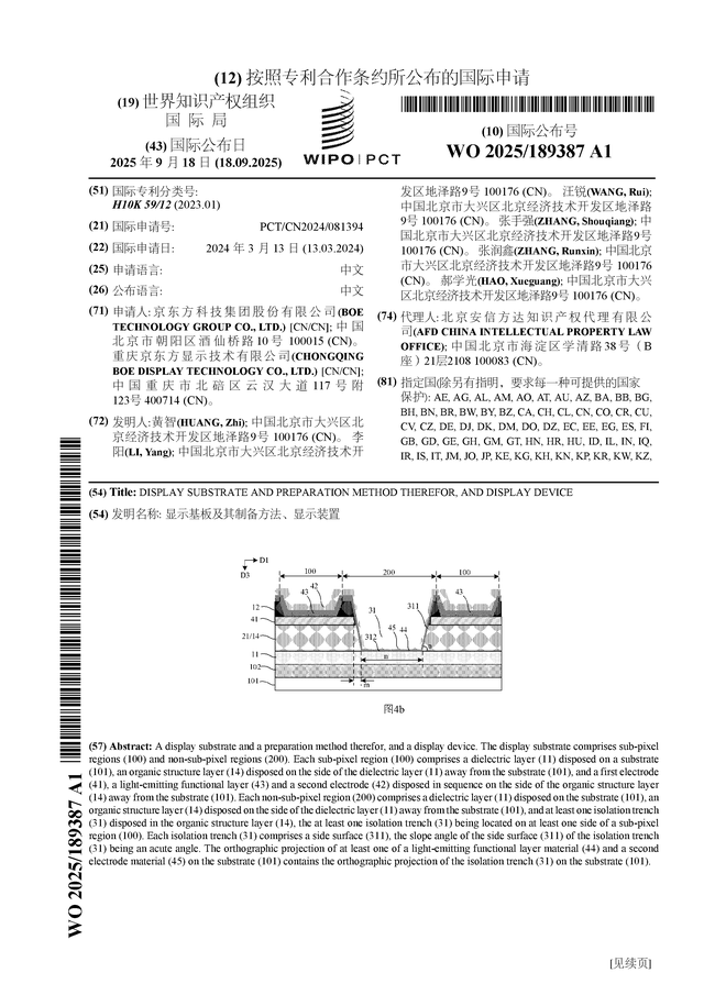 证券之星消息,根据企查查数据显示京东方A(000725)公布了一项国际专利申请,专利名为“显示基板及其制备方法、显示装置”,专利申请号为PCT/CN2024/081394,国际公布日为2025年9月18日。