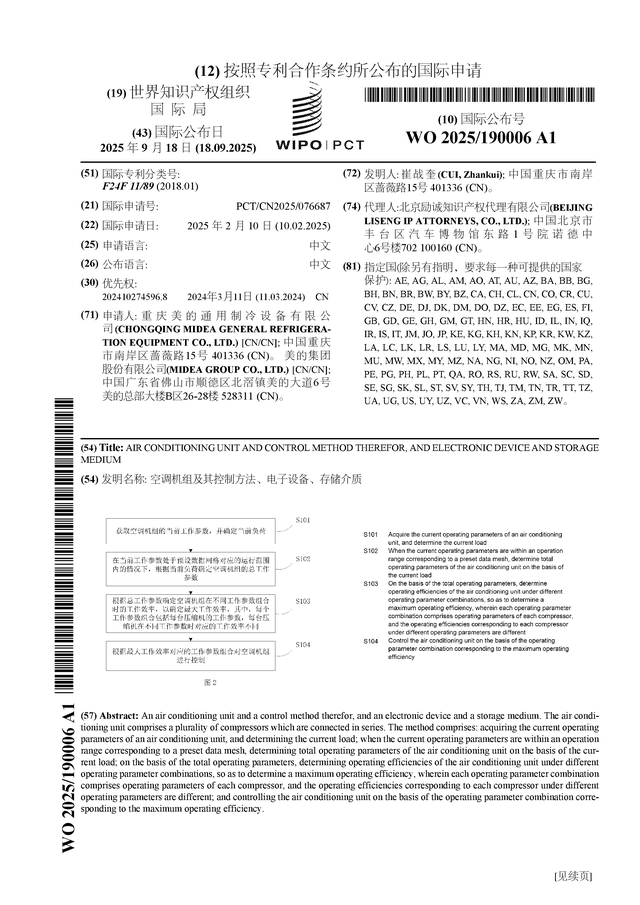 证券之星消息,根据企查查数据显示美的集团(000333)公布了一项国际专利申请,专利名为“空调机组及其控制方法、电子设备、存储介质”,专利申请号为PCT/CN2025/076687,国际公布日为2025年9月18日。