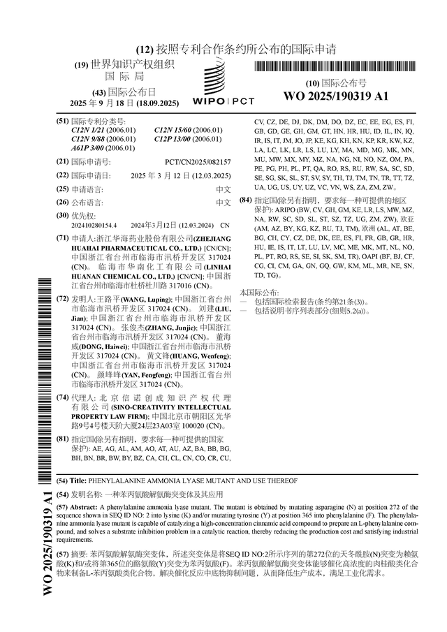 证券之星消息,根据企查查数据显示华海药业(600521)公布了一项国际专利申请,专利名为“一种苯丙氨酸解氨酶突变体及其应用”,专利申请号为PCT/CN2025/082157,国际公布日为2025年9月18日。