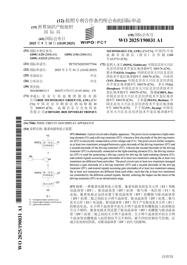 证券之星消息,根据企查查数据显示京东方A(000725)公布了一项国际专利申请,专利名为“像素电路和显示装置”,专利申请号为PCT/CN2025/077304,国际公布日为2025年9月18日。