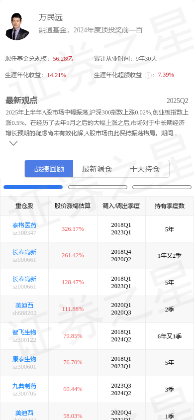 纽威股份(603699)是基金经理万民远的重仓股。,其在整个职业生涯内年化收益高达14.21%。万民远的大佬持仓 - 战绩回顾截图如下: