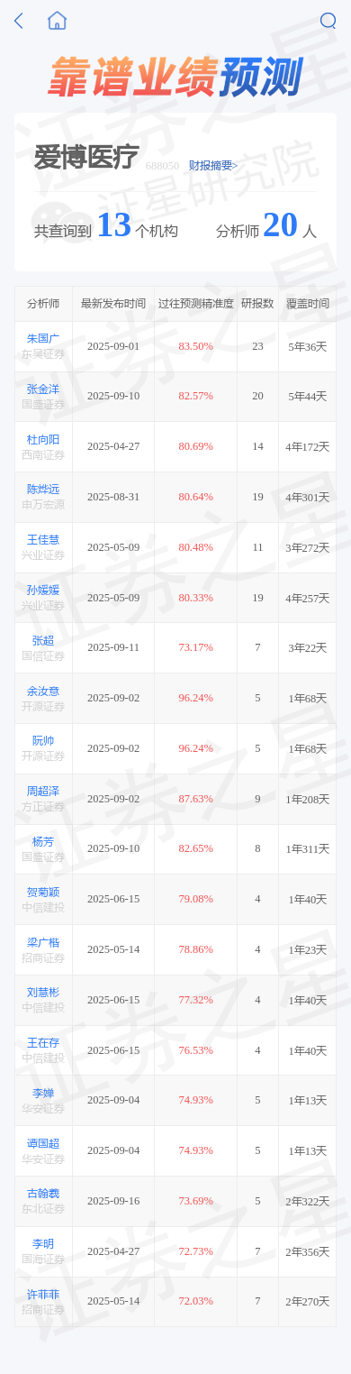 如果您对这家公司感兴趣,可以参考证星研究院统计的爱博医疗的分析师业绩预测数据,其中根据东吴证券的分析师朱国广预测公司未来PE为23.0(更多特色估值数据尽在证星研究院,所有数据均来源公开资料,期且所有资料都存在一定时间滞后,所有相关数据均不可作为投资决策单一依据)。