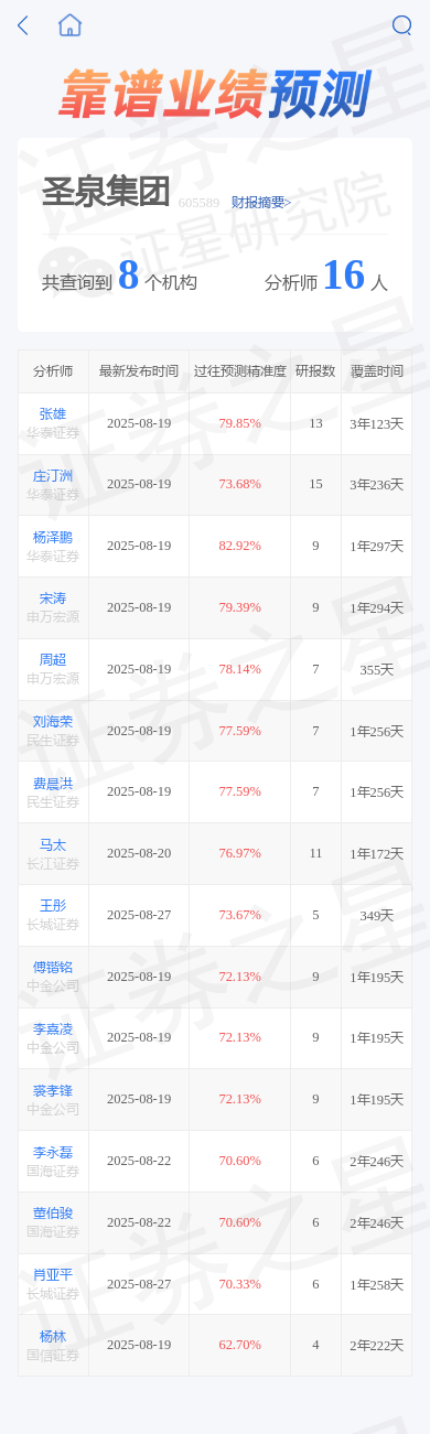 如果您对这家公司感兴趣,可以参考证星研究院统计的圣泉集团的分析师业绩预测数据,其中根据华泰证券的分析师张雄预测公司未来PE为18.0(更多特色估值数据尽在证星研究院,所有数据均来源公开资料,期且所有资料都存在一定时间滞后,所有相关数据均不可作为投资决策单一依据)。