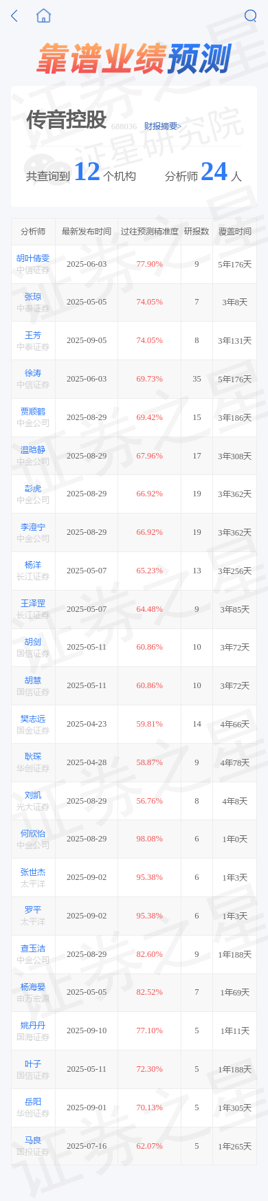 如果您对这家公司感兴趣,可以参考证星研究院统计的传音控股的分析师业绩预测数据,其中根据中信证券的分析师胡叶倩雯预测公司未来PE为12.0(更多特色估值数据尽在证星研究院,所有数据均来源公开资料,期且所有资料都存在一定时间滞后,所有相关数据均不可作为投资决策单一依据)。