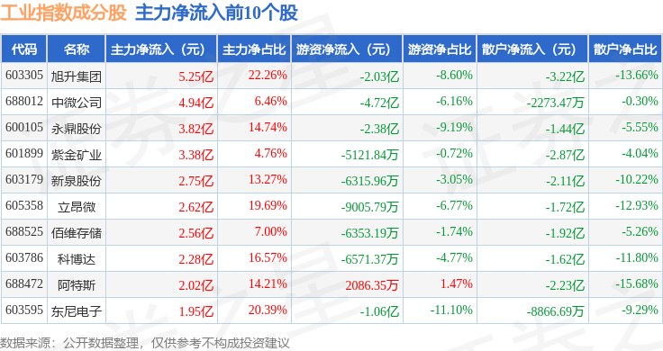 资金流向方面,工业指数(000004)成份股当日主力资金净流出合计361.28亿元,游资资金净流入合计118.89亿元,散户资金净流入合计242.39亿元。成份股资金流向详情见下表: