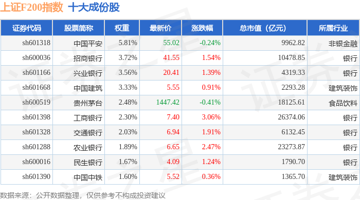 上证F200(000098)指数十大成份股详情如下: