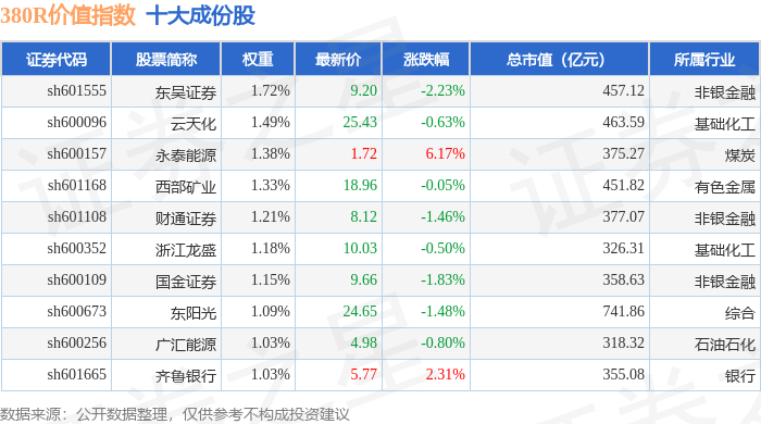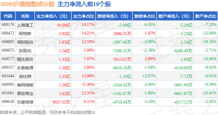 资金流向方面,380R价值(000120)指数成份股当日主力资金净流出合计72.65亿元,游资资金净流入合计15.3亿元,散户资金净流入合计57.35亿元。成份股资金流向详情见下表: