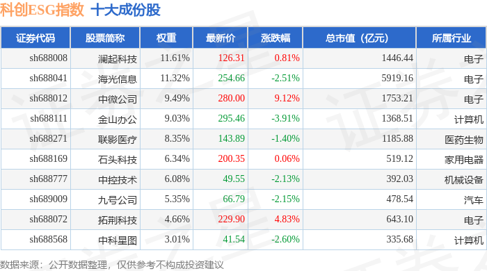 证券之星消息,9月23日,科创ESG(000691)指数报收于1475.15点,涨0.35%,成交689.8亿元,换手率1.89%。当日该指数成份股中,上涨的有19家,中微公司以9.12%的涨幅领涨,下跌的有31家,天岳先进以4.81%的跌幅领跌。
