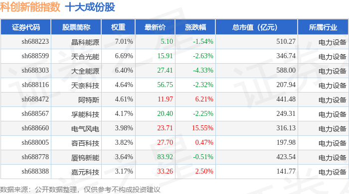 证券之星消息,9月23日,科创新能(000692)指数报收于1142.04点,跌0.22%,成交207.41亿元,换手率2.84%。当日该指数成份股中,上涨的有11家,电气风电以15.55%的涨幅领涨,下跌的有32家,海优新材以4.47%的跌幅领跌。