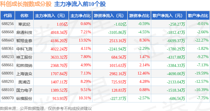 资金流向方面,科创成长(000690)指数成份股当日主力资金净流出合计18.06亿元,游资资金净流入合计13.81亿元,散户资金净流入合计4.25亿元。成份股资金流向详情见下表: