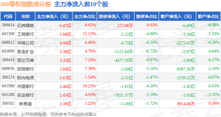 资金流向方面,300等权(000984)指数成份股当日主力资金净流出合计301.9亿元,游资资金净流入合计80.56亿元,散户资金净流入合计221.34亿元。成份股资金流向详情见下表: