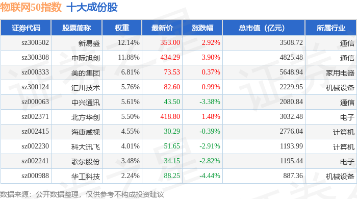 证券之星消息,9月23日,物联网50(399285)指数报收于5903.89点,涨0.0%,成交1632.3亿元,换手率4.66%。当日该指数成份股中,上涨的有15家,东华软件以7.41%的涨幅领涨,下跌的有35家,朗新集团以4.98%的跌幅领跌。