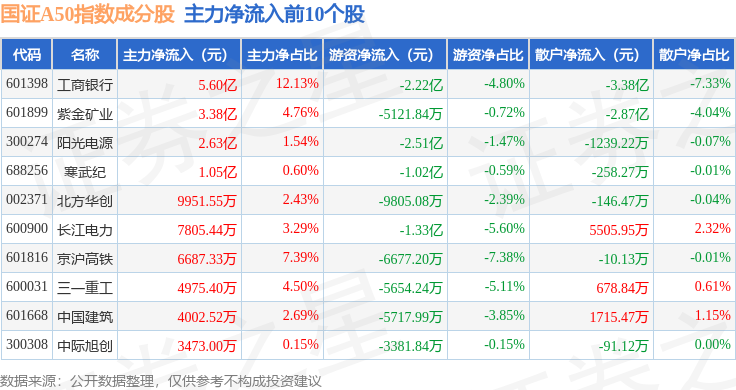 资金流向方面,国证A50(399310)指数成份股当日主力资金净流出合计128.09亿元,游资资金净流入合计30.65亿元,散户资金净流入合计97.44亿元。成份股资金流向详情见下表: