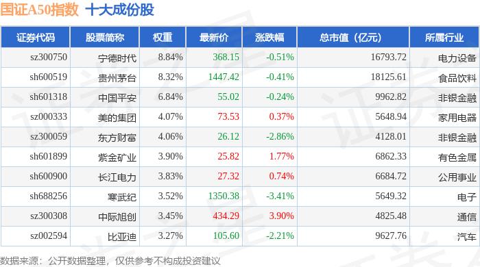 国证A50(399310)指数十大成份股详情如下: