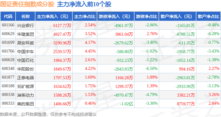 资金流向方面,国证责任(399369)指数成份股当日主力资金净流出合计96.0亿元,游资资金净流入合计21.41亿元,散户资金净流入合计74.59亿元。成份股资金流向详情见下表: