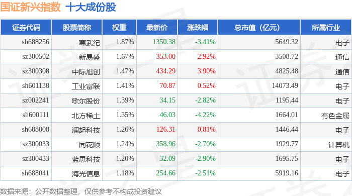 国证新兴(399392)指数十大成份股详情如下: