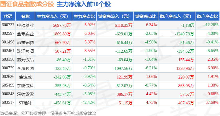 资金流向方面,国证食品(399396)指数成份股当日主力资金净流出合计19.45亿元,游资资金净流入合计5.95亿元,散户资金净流入合计13.5亿元。成份股资金流向详情见下表: