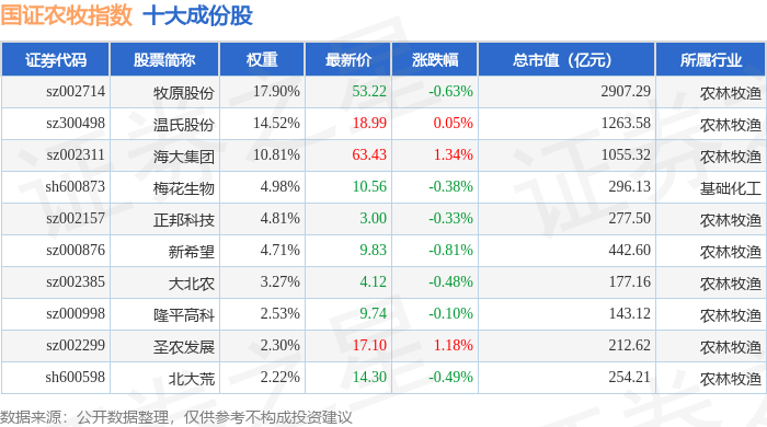 证券之星消息,9月23日,国证农牧(399435)指数报收于4114.13点,跌0.39%,成交101.08亿元,换手率1.65%。当日该指数成份股中,上涨的有6家,荃银高科以1.43%的涨幅领涨,下跌的有34家,瑞普生物以3.21%的跌幅领跌。