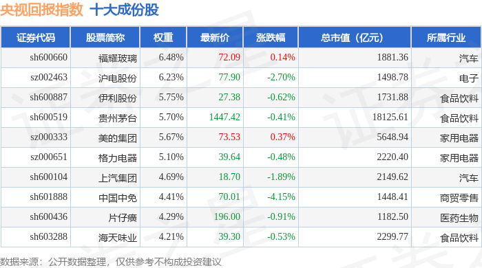 央视回报(399553)指数十大成份股详情如下: