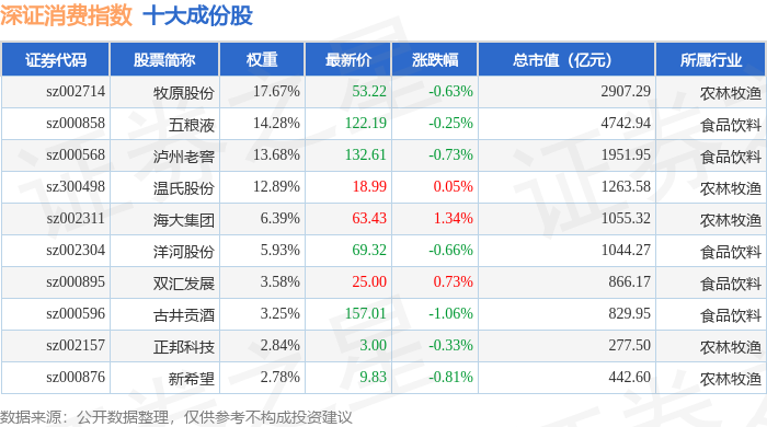深证消费(399617)指数十大成份股详情如下: