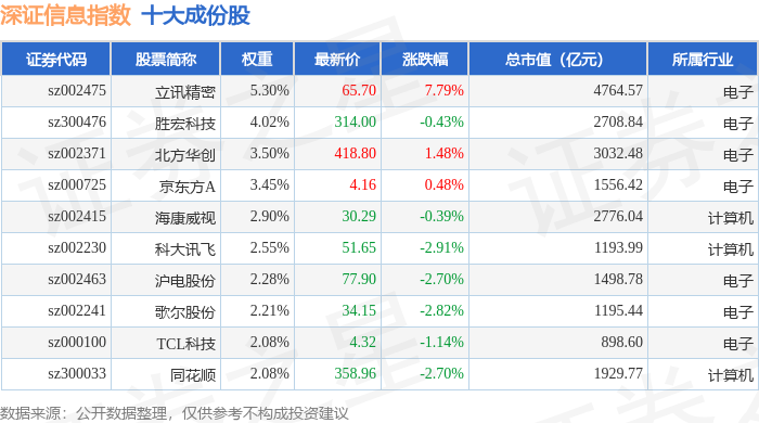证券之星消息,9月23日,深证信息(399620)指数报收于5781.46点,跌0.45%,成交3314.36亿元,换手率4.83%。当日该指数成份股中,上涨的有36家,长川科技以20.0%的涨幅领涨,下跌的有104家,崇达技术以6.04%的跌幅领跌。