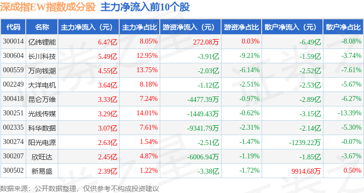 资金流向方面,深成指EW(399659)指数成份股当日主力资金净流出合计371.14亿元,游资资金净流入合计77.14亿元,散户资金净流入合计294.0亿元。成份股资金流向详情见下表:
